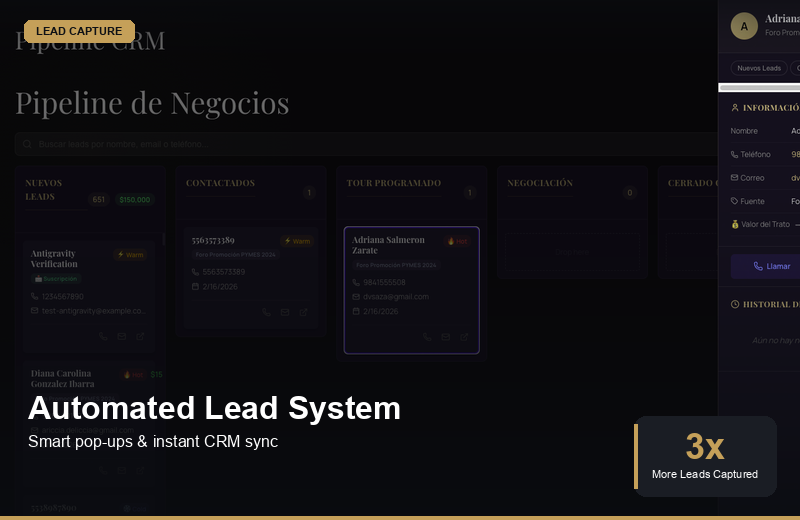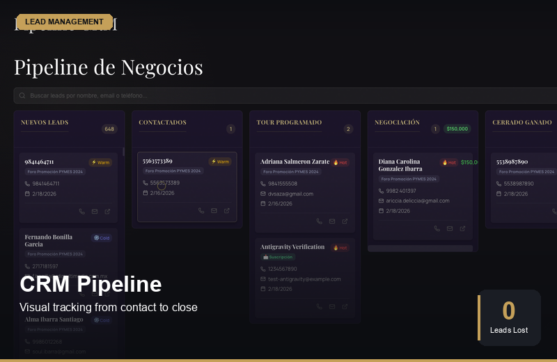 Visual drag-and-drop lead tracking from first contact to closed deal. No manual data entry or lost contacts.